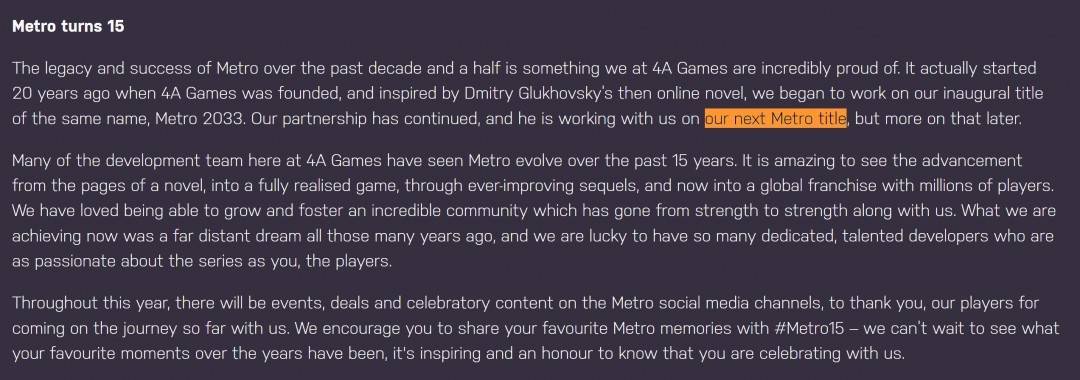 4A Games《地铁》系列迎来发售15周年,在官网发布的博客中,4A Games确认原著在线小说的作者Dmitry Glukhovsky正在和他们合作,开发下一款《地铁》游戏。