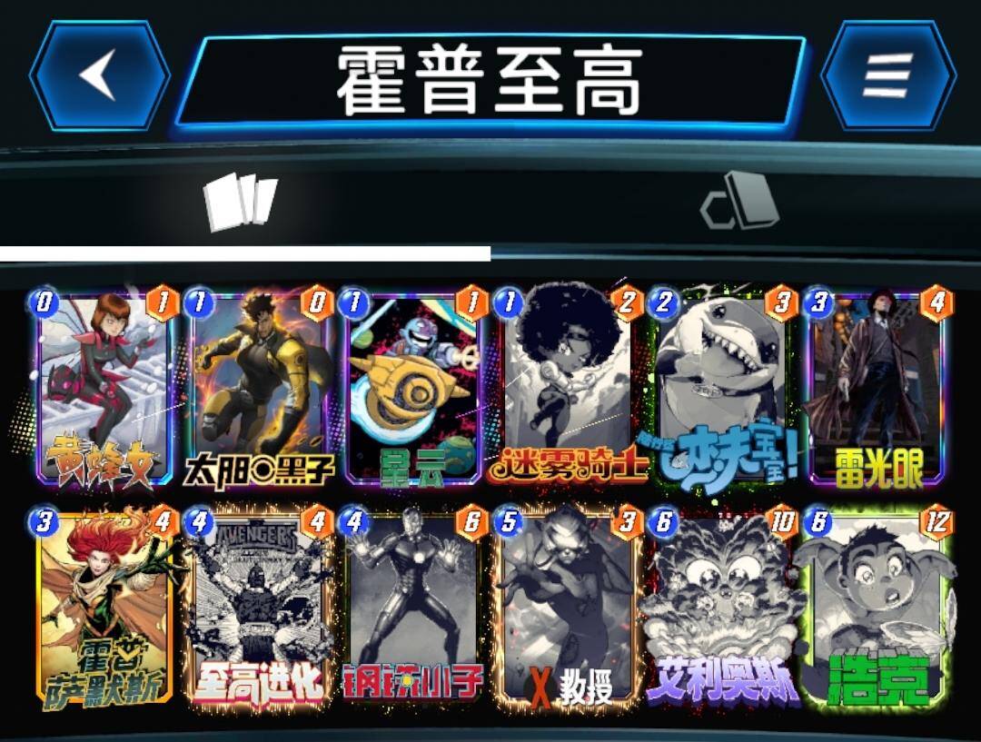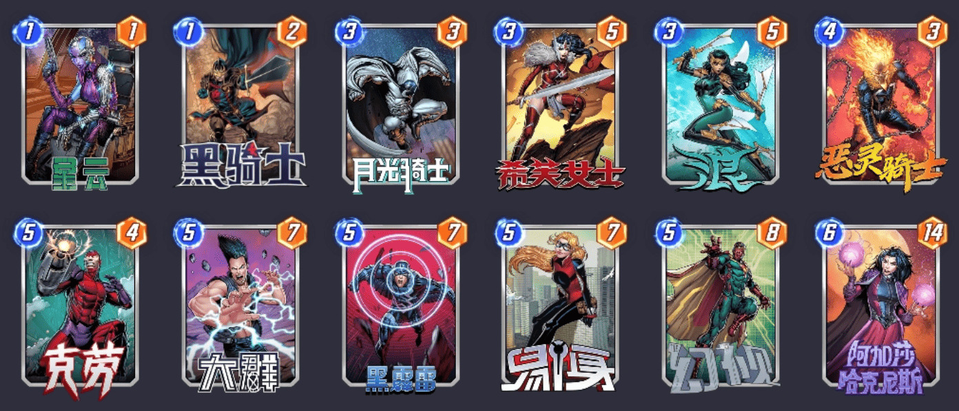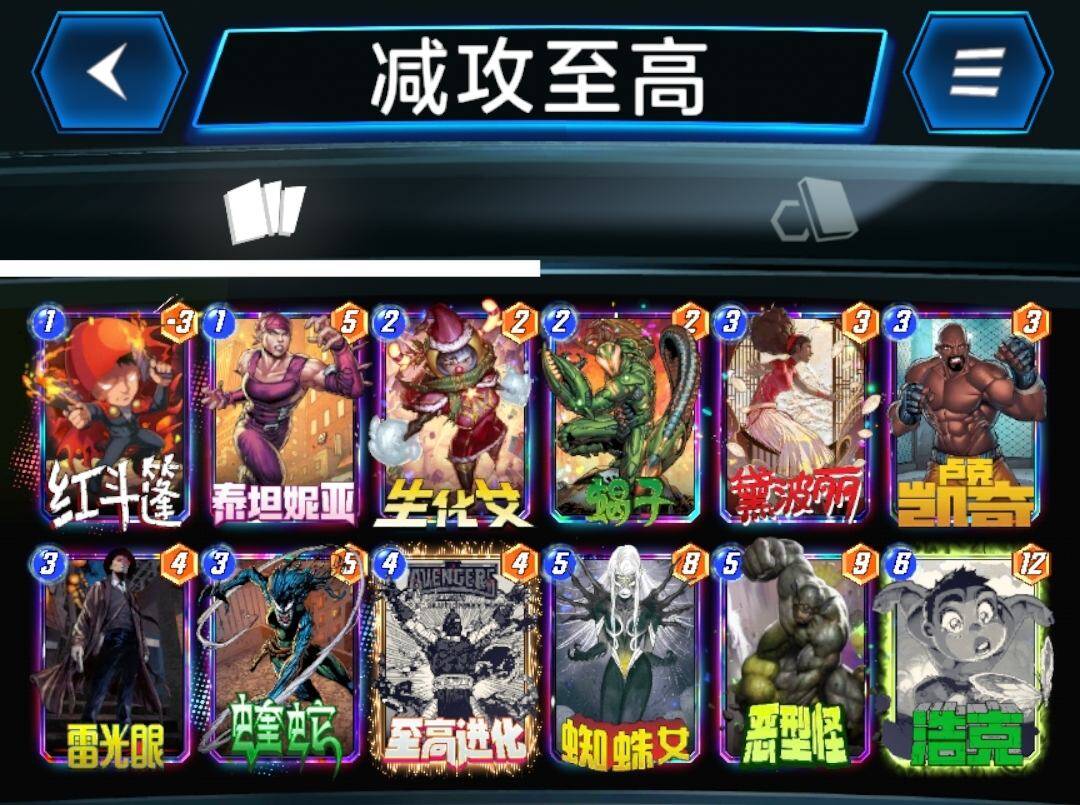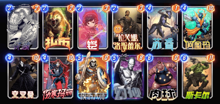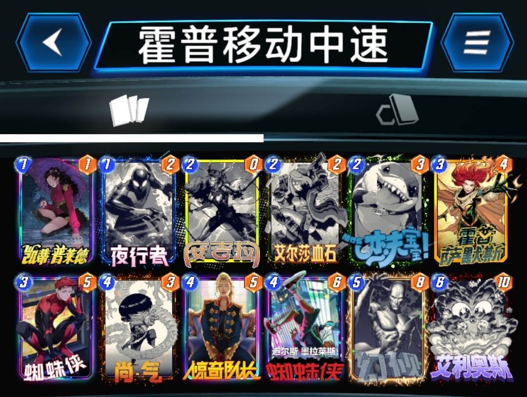 灭霸不行之后,霍普移动卡牌齐全的玩家开始玩这套卡组,虽然卡组名字上带移动两个字,但是实际操作上并不烧脑,也不需要移动卡牌来增强战力,这套卡组中的移动只是为了填满一路之后移走,空出位置,继续刷血石和安吉拉,最后一回合那些还没移动过的卡牌,就算劣势有也可以移动和对手猜边,又到了经典的你猜我动不动的环节。蜘蛛侠可以根据个人喜好替换成蛛丝,这样可以更容易打出迈尔斯。