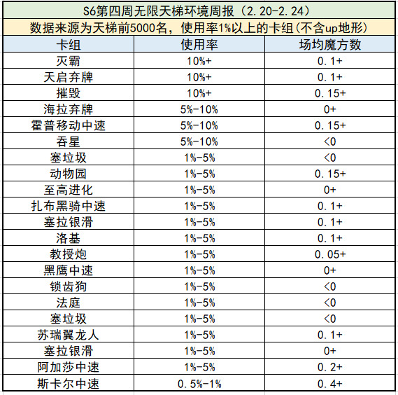 黑鹰中速、锁齿狗、法庭、垃圾炮表现都一般,魔方数在0附近徘徊,有其他卡组可选的情况下,还是玩其他卡组吧。当然不需要冲分和刷资源的时候,想玩什么就玩什么,游戏才能给你带来快乐,看淡输赢,才会有更好的游戏体验。