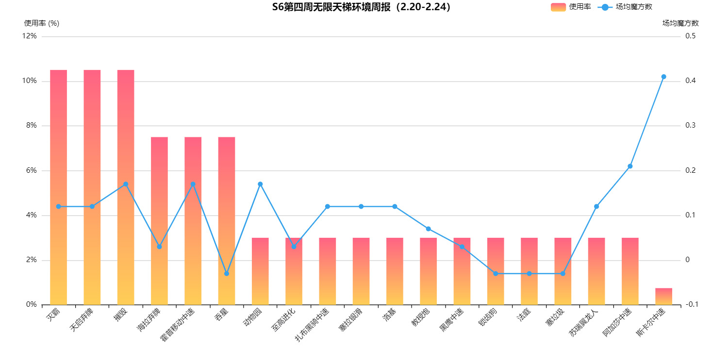 经过 OTA 平衡性调整,本周游戏环境焕然一新,各类卡组纷纷登场,对战过程不再单调乏味。其中,灭霸、弃牌和摧毁卡组备受玩家青睐,使用率均超 10%,魔方数表现也颇为亮眼,分别达到 0.1 及 0.15 以上。