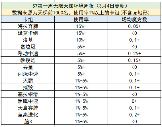 赛季第一周数据来源为天梯前1000名,都是高手,所以卡组整体魔方数会略微偏低一些。环境中卡组还是比较多样化的,和我们自己实战的感受比较一致。
