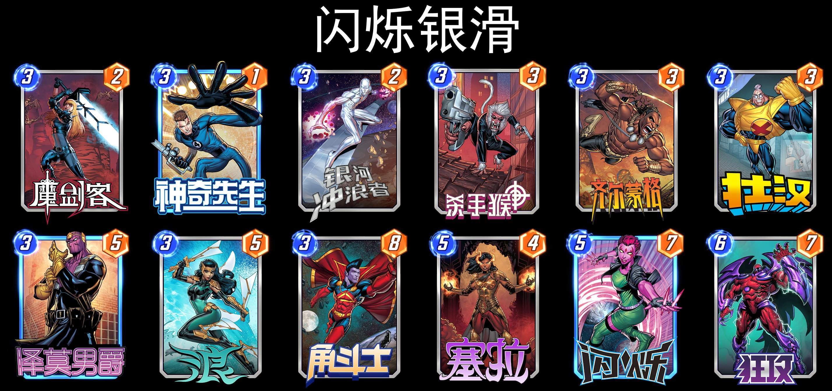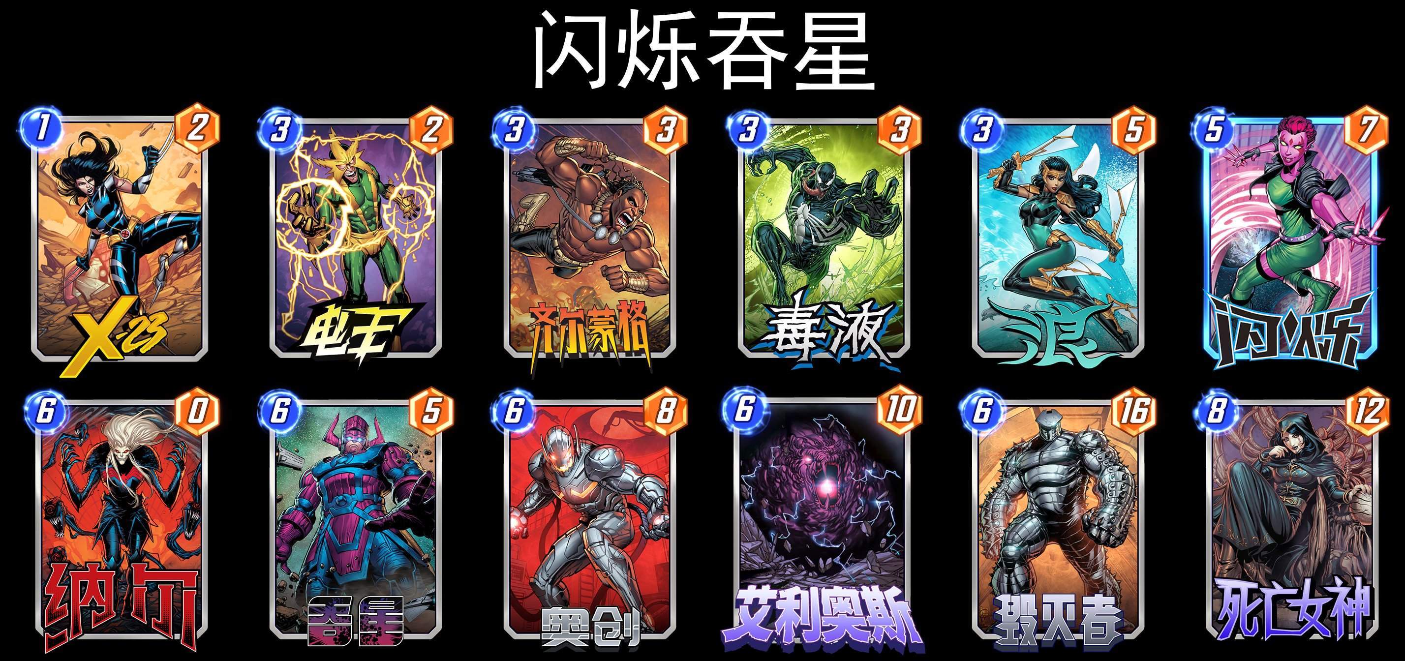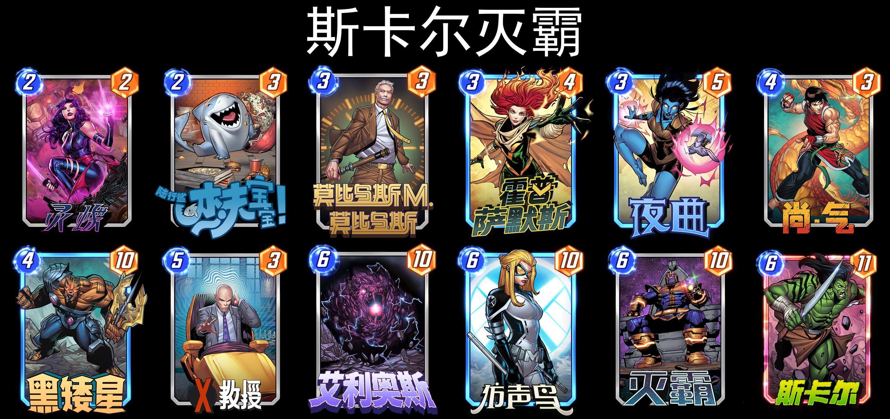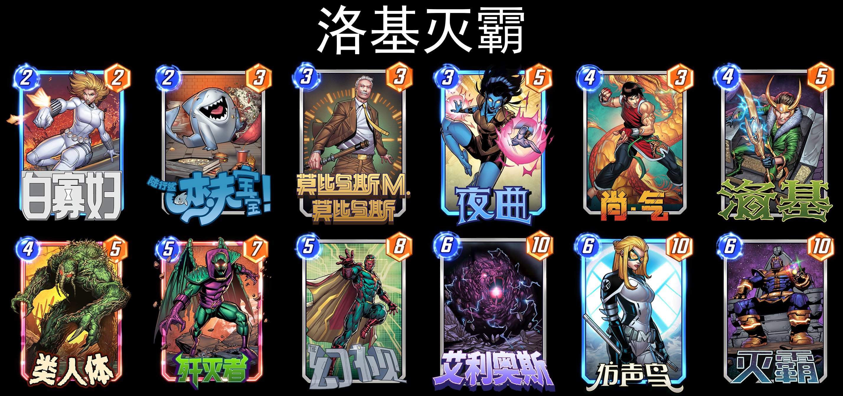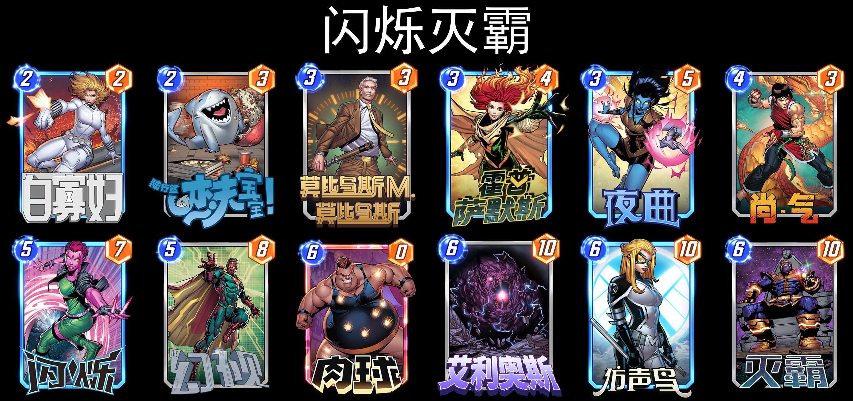 三套灭霸构筑,都是在原有的基础上,加入了新卡(闪烁、夜曲、白寡妇)进行补强,从数据上来看,灭霸依然还是可以玩的,遇到过开局就无脑加倍的灭霸,还没打赢,就很无奈。╮(╯▽╰)╭