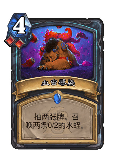 再来看看两红优质过牌——血虫感染,它的效果是4费过两张,然后站两个水蛭,相当于回2血打2,站两软嘲讽,然后抽两张,DK本来就缺过牌,这张过牌可以说是相当优质了,血DK是一定要携带的。