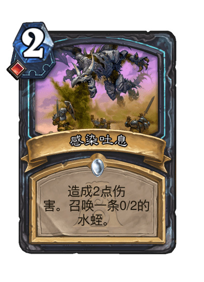 先看感染吐息,感染吐息相当于打三回一然后站一个软嘲讽,很不错的单卡,正好弥补了我们前期没有低费小解牌的缺点,应该是新版本狂野DK必带卡。