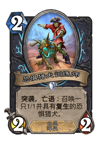 首先是恐惧猎犬训练师的生命值砍了一点,这一点在对抗快攻时其实是很致命的,因为多一血的话我们前期在对抗海盗时可以白吃一个112海盗,然后站一个21的狗继续做随从交互,但即便如此我觉得DK还是要携带这张牌,恐惧猎犬训练师即便被削也有着强大的赖场能力,更别说还能提供三个残骸。