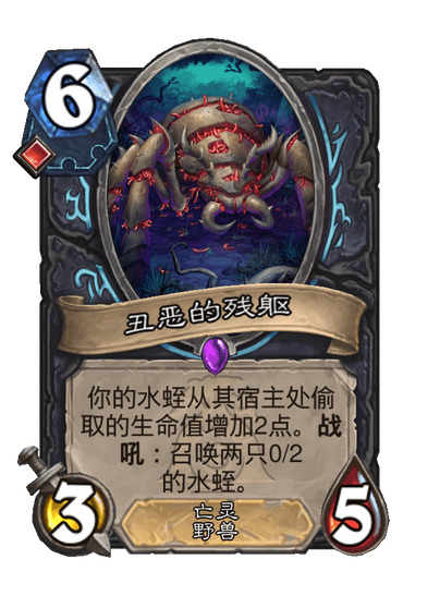 6费的丑恶残躯我的预构筑里并没有携带,但我认为也是有进构筑的价值的。本身合格的身板,加上打6回6的保底,足以作为一张高质量单卡进构筑,更别说配合额外的水蛭还能有更多的收益,之所以暂时不携带它主要还是因为它的种族——野兽,影响了馆长和偷牛贼的检索。但新版本除了偷牛贼以外还多了馆长的野兽定向检索,所以多携带一张野兽是不是也没有问题呢?目前我还不太确定,但这卡的质量本身是很高的,有进构筑的价值。