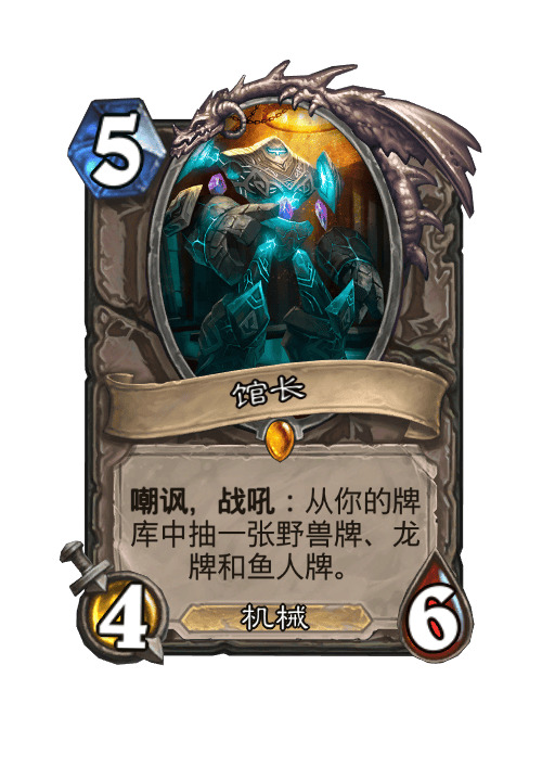 最后是增强后的馆长,5费的馆长,合格的身材,最多抽三张,毫无疑问是巨大的增强。馆长能检索鱼人,野兽和龙,而我们的套牌里这些种族的卡都有携带,鱼人:芬利,吃手手,野兽:八爪,龙:锋麟,并且馆长还能被时间线加速机抽到,增强了加速机的抽牌轴。最关键的是,芬利和八爪的检索是能对对局产生质变的,所以馆长在新版本DK的构筑中必然是39+1的存在。