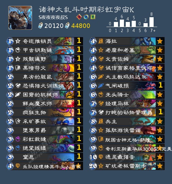 (提一嘴:场面随从交换要考虑卡对手横扫,并时刻关注自身血量,提防被穴居人,果子偷鸡,遇到牛里带红龙的那种没办法防,极端情况时把最强音当做一张解牌来使用,这是检验新老彩K的分水岭。)