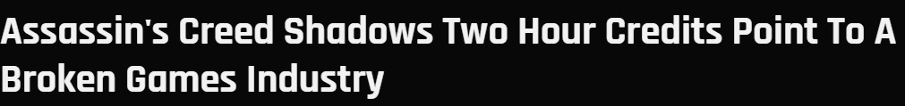 ·根据对过去发售的主流游戏通关谢幕作比较,上一部育碧大作《刺客信条:幻景》约50分钟,这回直接翻倍,其他公司的大作比如《最后的生还者2》16分钟,《赛博朋克2077》40分钟,本次的《刺客信条:影》算是刷新了史长新纪录。
