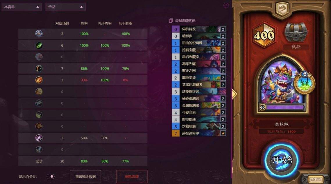 说是奥秘贼,实际上是带上了奥秘哥的节奏树贼,有奥秘哥的干扰,前期的铺场节奏对手往往难以处理,在关键回合(如dk的六费)更能直接卡住对手的关键节奏;面对快攻内战,奥秘也能一定程度缓解对手的攻势。奥秘哥作为战吼随从,与盗贼的回手也有很好的配合。欺诈之网收322血赚,叫杀回合配合暗影步连挂四个奥秘强制对手空过……这张卡的加入,让节奏贼的进攻节奏上了一个档次。