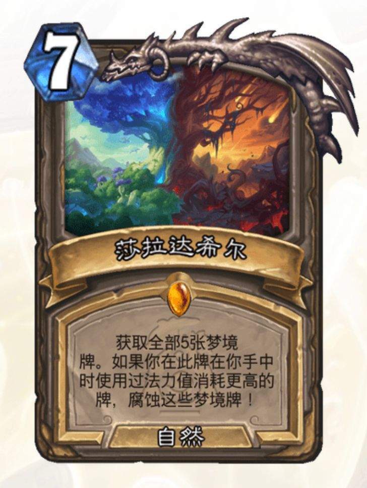 然后就是这版本对贼最大的加强:莎拉达希尔(下称大树)。已腐蚀梦境牌质量爆表,而沙箱恶霸就能轻易“腐蚀”(此为机制),往往6费配合伺机待发或者暗影步就能够做到大型返场,自带10点斩杀(梦魇+**),也十分契合贼的进攻性。大胆预测大树将保证往后一年内盗贼的后期资源。