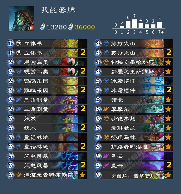 前期苟活aoe拉满,还有冰霜摆件,拥有一定快攻抗性。检索链很完美,哈加莎找星云与摆件,除了mmr所有随从都是战吼可以被童话林地检索,馆长定向抽伊瑟拉和玛洛恩,萨维斯和观鸟找启动缺失的组件。