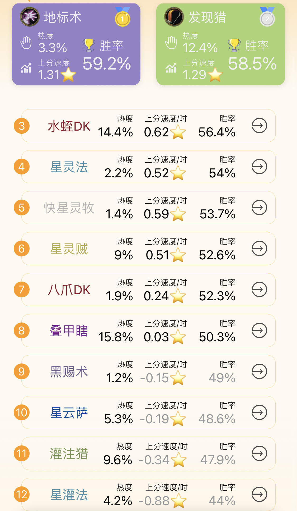 胜率的前两位是发现猎(地标巨人)和地标术,它们其实可以被看作外服高分段环境的缩影。外服由于本月根据排名结算比赛分,影响后续比赛资格,所以外服高分段都比较保守,都采用了新卡较少的老卡组这种较为稳定的选择。当然这里面也可能有国服选手创新热情更积极的原因在。这两套卡组的强度都不算低,是属于不会有错但也不过于超标的范畴,至于这样新卡较少的卡组好不好玩,就见仁见智了。