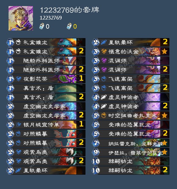 由于斩杀回合可以直接出3龙所以在斩杀回合前我们只要做5条龙任务就可以了,一般来说只要有555过牌龙任务是一定可以做完的。还有一点是223找龙就找低费可以扔就行,本卡组本质上是中速otk所以过牌效率是最重要的,有需要的话星轨光环尽量留给虚灵,5费能出555龙这把就基本可以拿下,然后6费或者7费回合一般用观鸟检索777,先过龙再检索可以大大提高找k牌效率。