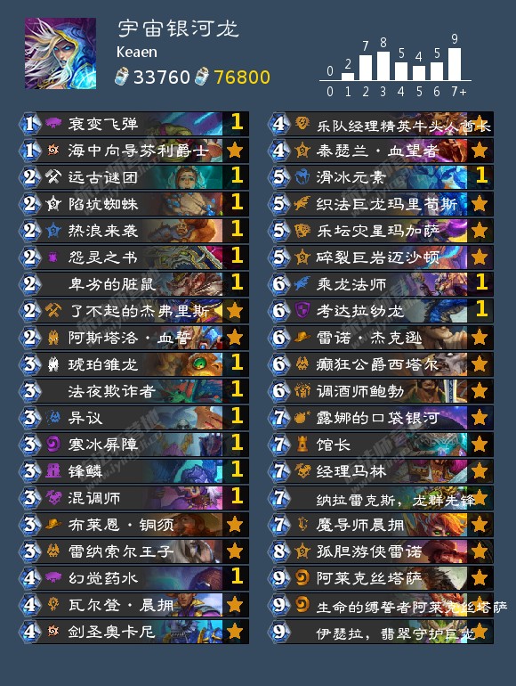 1w7左右20把12-8,感觉比之前所有版本的宇宙银河法都要好玩,因为324龙亡语稳定抽银河,龙群先锋让双红龙不减费也能打combo,也可以打节奏8费先锋+伊瑟拉+3非常丝滑,伊瑟拉提供的15水晶让操作空间大了很多,减费后还能1回3偷费配合铜须1回6。总之因为先锋和伊瑟拉的存在提供了非常多花里胡哨的combo,操作爽感更上一层。