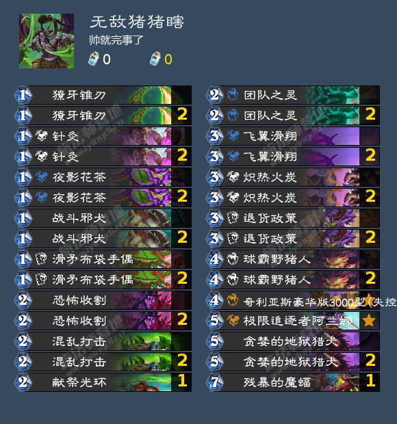 这两天瞎子已经不是瞎子了,完全没有进攻欲望,只知道龟龟,这怎么可以呢?所以我们把龟龟去掉换上了高贵的野猪人。卡组如下: