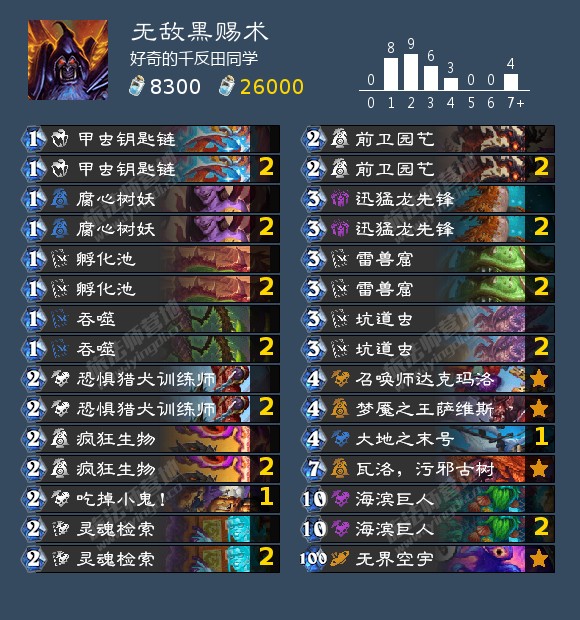 这套卡组因为前期有杂毛战场,中期88巨人在如今的环境中更是极难处理,后期则大部分时间10费之前就能攒出平均20+的斩杀,对主流的dk、法师、猎人卡组等都能均势甚至优开,不过对阵比较顺的星舰瞎很难打烂他的龟壳。