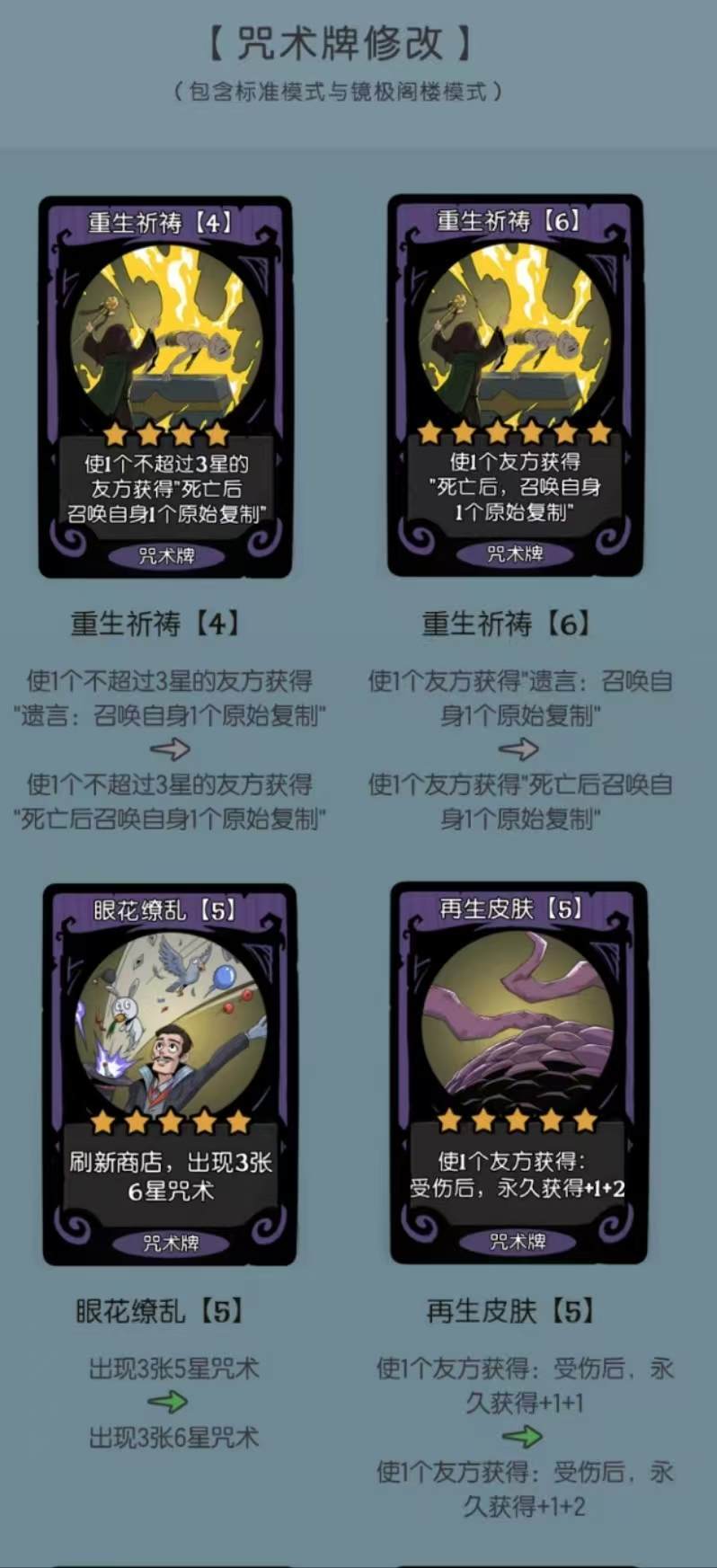 四本咒术重生祈祷和六本咒术重生祈祷的效果都从遗言:召唤自身1个院士复制改为死亡后召唤自身1个原始复制。这个咒术的改动对环境的影响很大,最重要的影响就是被重生祈祷使用的随从不再享受到死灵傀儡师、鼠王等随从的效果,例如战士阵营的宫殿卫兵、暴躁领主再被使用重生祈祷后也只能固定召唤一个自身原始复制。眼花缭乱的效果从出现3个五本咒术改为3个六本咒术,这个咒术现在可以提前获取高本咒术,是一个不错的咒术选择。五本咒术再生皮肤效果从+1+1修改为+1+2,这个咒术依附于自伤流玩法,只在进行自伤流时选择。