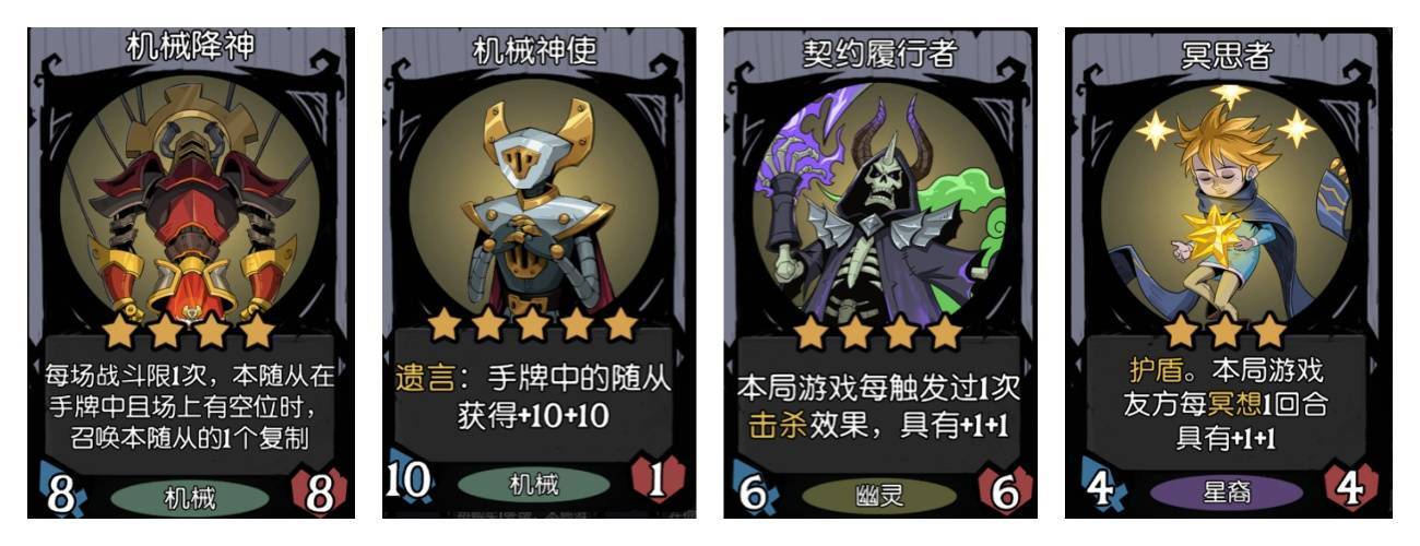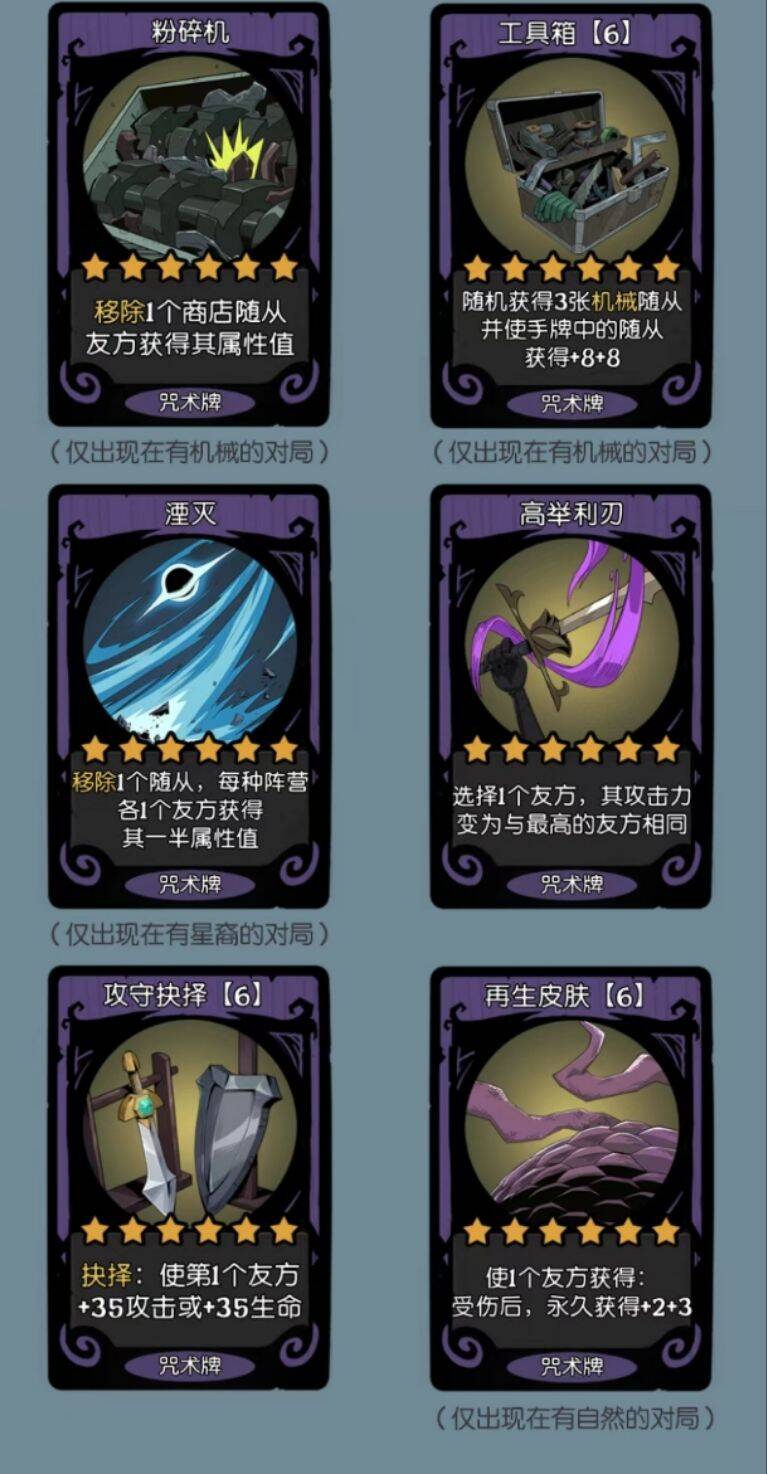 五本咒术工具箱是随机获得2张机械随从并使手牌随从获得+5+5,六本咒术工具箱则是获得3张机械随从并使手牌随从获得+8+8。六本咒术粉碎机的效果是移除1个商店随从并让全体友方随从获得其属性值。这三个咒术都仅在机械对局里出现。工具箱自身作为一个可以提供大量资源牌的咒术本身就极为通用,如果搭配新增随从机械降神和机械神使可以加速手牌流玩法的成型。粉碎机无论是搭配商店流的玩法还是搭配击杀流的玩法移除契约履行者,搭配冥想流的玩法移除冥思者都可以大幅增长随从身材。
