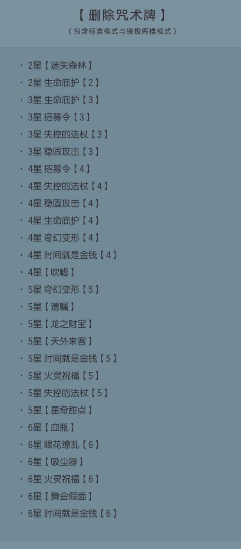 被删的咒术很多,如上图所示,但大部分咒术的删除对整体环境的影响并不大,其中比较重要的是吸尘器的删除会增加后期身材转移的成本,时间就是金钱类型咒术、龙之彩宝、遗嘱的删除会减少中后期补充经济的手段,舞会假面的删除则是因为新赛季的双技能机制。