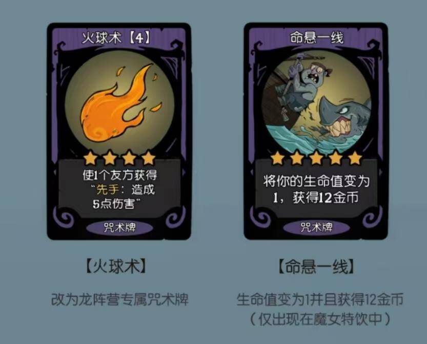 四本咒术火球术修改为只在龙对局里出现,这个修改毫无疑问削弱了标准模式的落地附着玩法,从此以后不能再通过钢铁之躯身上高额的火球术数量来进行清场效果。五本咒术命悬一线的效果进行了文字修改,但仅出现在魔女特饮中。这个修改还是进一步削弱了后期获取经济的手段,同时也对黑猫进行了一定的削弱。