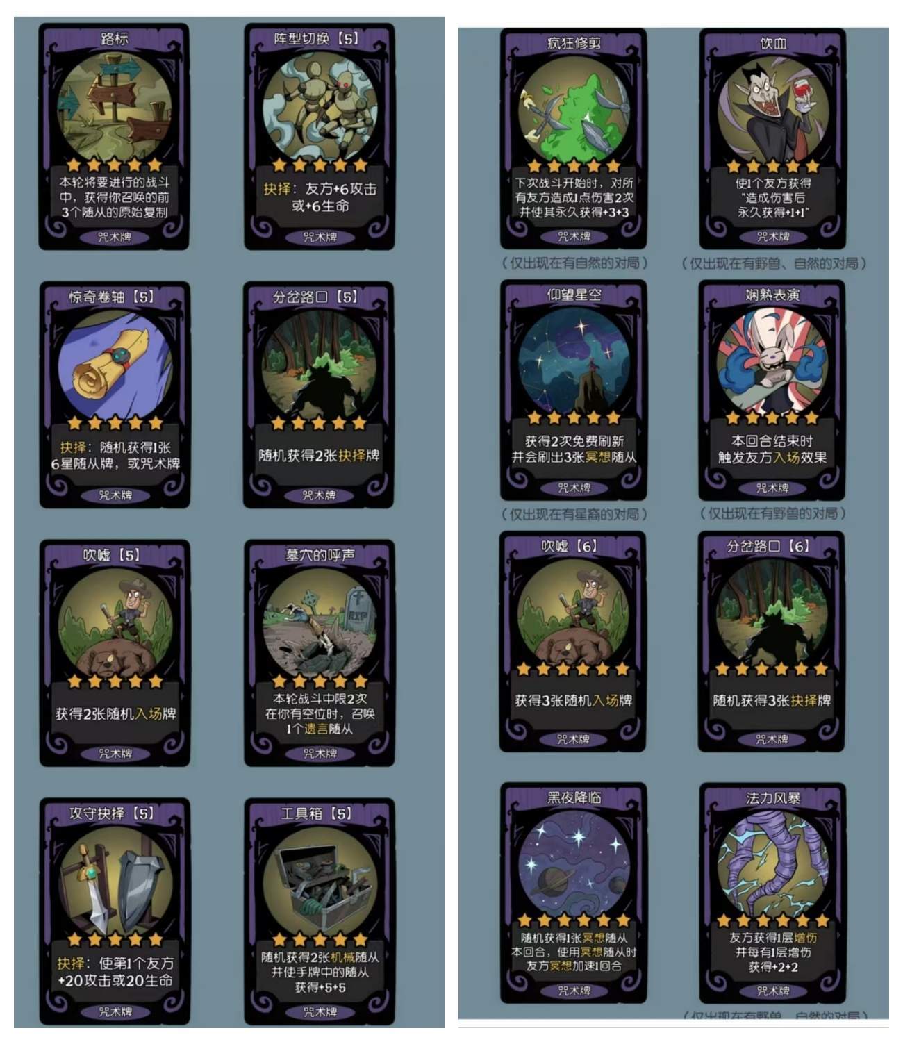五本咒术疯狂修剪的效果是会在战斗开始时对所有友方造成伤害俩次并永久+3+3,仅出现在自然对局。这个咒术毫无疑问是弥补镜极阁楼自伤流仙人球和南瓜王被删除后无法启动的问题。五本咒术饮血的效果是会让一个友方造成伤害后获得+1+1,仅出现在自然、野兽对局。这个咒术肯定是搭配例如小树精、烟火大师等伤害频率高的随从,不过这个咒术所加身材较为有限,不算特别好用。五本咒术仰望星空效果是获得2次免费刷新并刷出3次冥想随从,六本咒术黑夜降临效果是随机获得1张冥想随从并加速本回合冥想效果,仅在星裔对局出现。这俩个咒术都对冥想流玩法非常有用,且黑夜降临在没有黑夜行者的回合里可以加速我们阵容的转型速度。六本咒术法力风暴的效果是让友方获得1层增伤,每具有1层增伤获得+2+2,仅出现在自然、野兽的对局。这张牌在镜极阁楼删除了大耳火犬后对于增伤流显得格外重要,是增伤流必选的咒术。