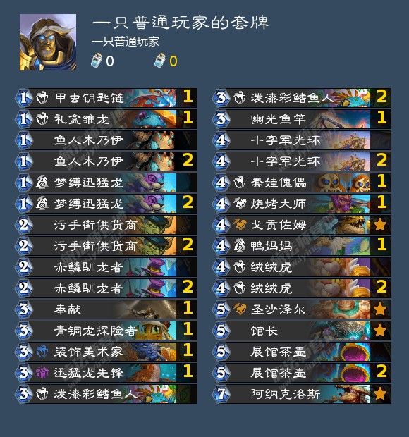 新版本鸭妈妈是我个人理解带的针对牌,配合光环可以完美解猎人的1-1跳虫,自带4个频率也非常契合我们铺场的思路,还有高贵的野兽属性! 最后我为啥要构筑一套“什么都有”的圣骑呢?起因是我看到社区一个老哥构筑了一套馆长骑,一时兴起但是复制不了套牌!我想着思路都差不多于是决定自己组一下,当然构筑完发现差别还是挺大的(我个人理解他那套以鱼人为主)当然一样地打不过dk……不过馆长并不算这套的核心,我理解是锦上添花,必须打出馆长的对局不一定能赢。(甚至感觉不带也没有影响……)