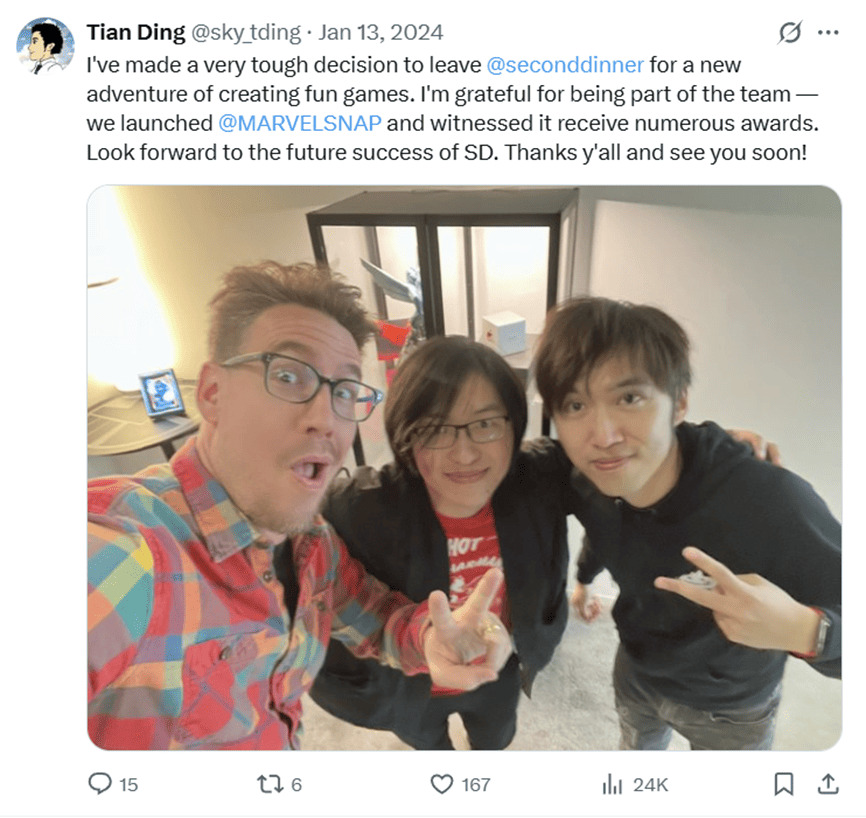 2021年12月4日,Team5首席数据科学家、国服社区的好朋友丁天宣布离职,离开暴雪。对国服炉石社区来说,丁天离去是一个巨大的损失,因为他不仅是Team5为数不多的国人,更很可能是迄今为止唯一主动来了解国服社区的开发人员。Team5完全可以再招一个数据科学家,但丁天的中国通能力和交流意愿恐怕是很难找到人传承的了。