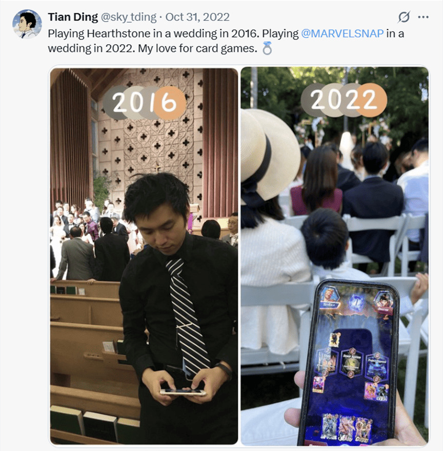 丁天曾发推文称:“他曾在两个不同的婚礼上在游玩《炉石传说》与《Marvel Snap》”,自己甚至视卡牌游戏为“伴侣”。