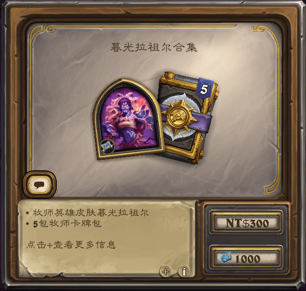 含构筑模式牧师新皮肤“暮光拉祖尔”和5牧师包,售价600奥术宝珠(国服)/1000符文石(外服)。