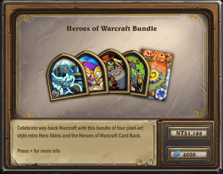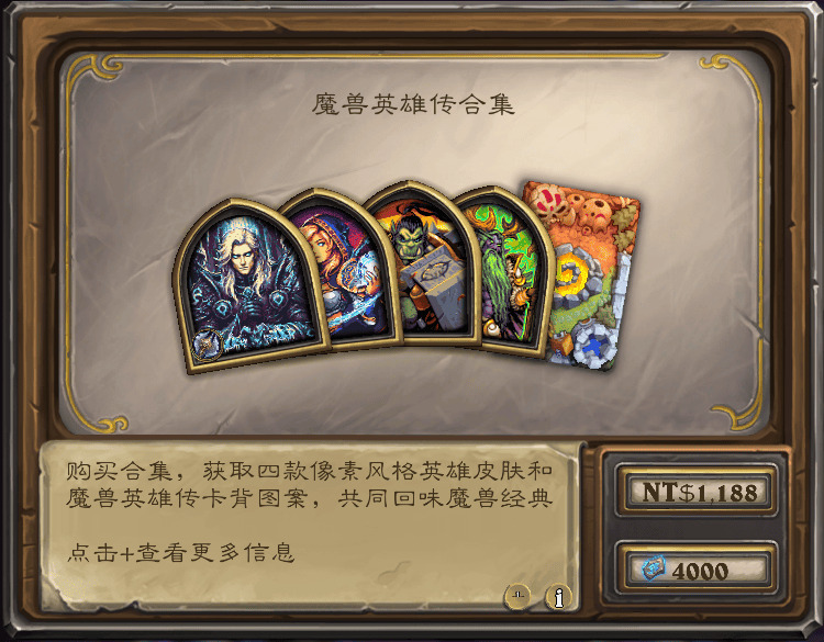 含构筑模式死骑新皮肤“诺森德的阿尔萨斯”,法师新皮肤“壁炉谷的吉安娜”,萨满新皮肤“奥格瑞玛的萨尔”,德鲁伊新皮肤“永恒的玛法里奥”,和新卡背“魔兽英雄传”,售价2680奥术宝珠(国服)/4000符文石(外服)。