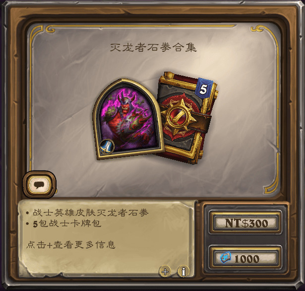 含构筑模式战士新皮肤“灭龙者石拳”和5战士包,售价600奥术宝珠(国服)/1000符文石(外服)。