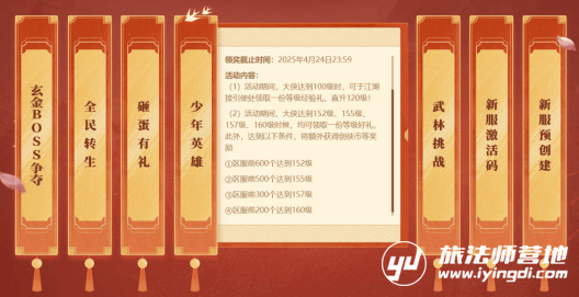 - 活动期间,江湖接引使将记录大侠在4月4日-4月25日24:00期间进行“江湖豪杰”“武林名仕”的招募次数。