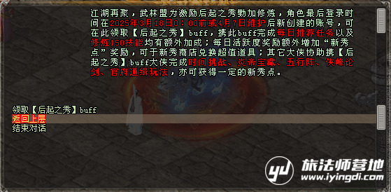 1、3月18日后未登录新服【腾蛇踏渊】的大侠或活动开始后创建的新角色,等级≥135级时可在江湖接引使处领取【后起之秀】BUFF享受50%技能经验加成与双倍侠义赏奖励,领取每日活跃奖励时候将获得新秀令。