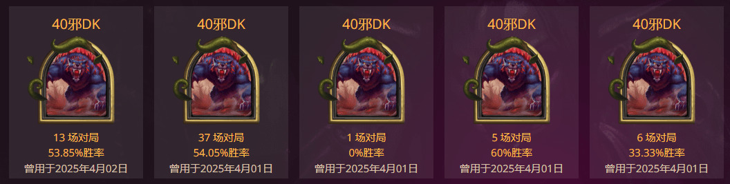即便现在的环境控制横行,对我们非常不利,但实战下来依旧有高于50的胜率(由于存在信息差,这个胜率可能偏高),我上个月玩宇宙DK也就50胜率左右。所以40三绿邪DK是值得一试的,不过构筑目前还处于起步阶段,还有不成熟的地方需要优化,各位老哥如果有什么意见可以互相交流交流,让我们一起重振牢K在狂野的荣光(虽然好像就没辉煌过)。