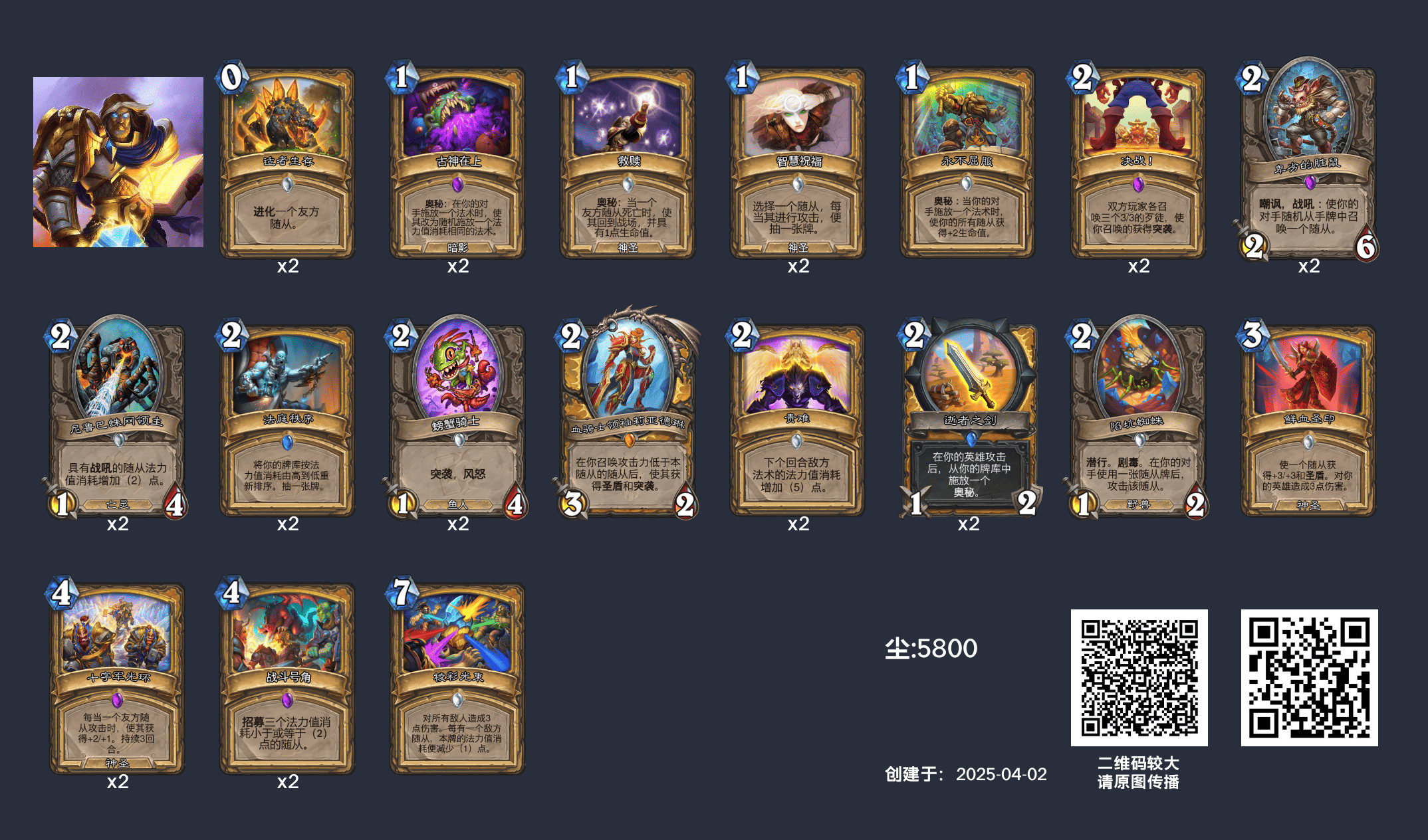 一套大家都不陌生的节奏型进攻卡组,卡位上选择了双决战来增加决战棱彩的概率,一般情况下起手留下法庭秩序,战斗号角,逝者之剑,对阵慢速可以留尼鲁巴蛛网领主,对阵otk可以留卑劣的脏鼠,打快攻留棱彩光束,决战可以后手酌情留,或配合棱彩或法庭一起留下,如有节奏需要可留适者生存和螃蟹骑士。