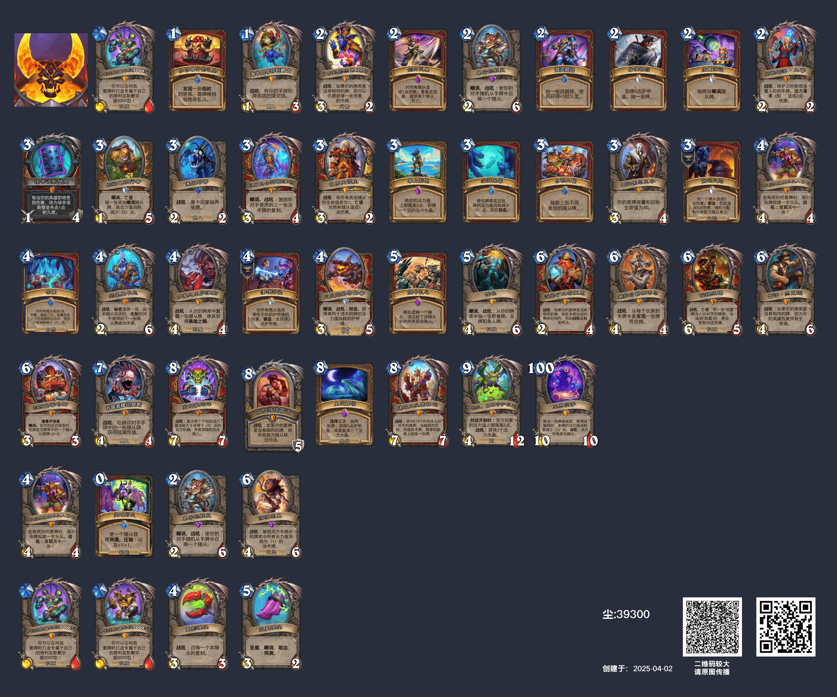 这套宇宙战是走进攻的,没带萨隆苦囚+维伦,流亡者领袖的无限维伦思路,也没办法稳定叠百甲。卡组亮点在于,神铜须之后钢铁战蝎单卡能贡献30点伤害,配合发明家砰砰的复活很少有职业能扛得住。特别是在打法师这种有冰箱的职业的时候,这是为数不多能威胁法师生命的牌。