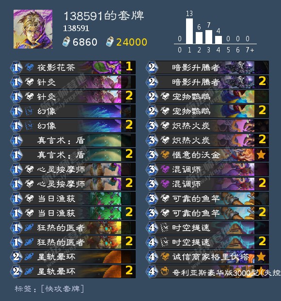 这月本来十一星开打,用蛋猎和地标术一直不太顺,以50%胜率靠额外星磨到了钻五,蛋猎总排劣势对局,术士玩的又太累。钻五之后换了套快攻牧,没想到意外的好用(当然运气确实也好),8-2上了传说。打法思路:起手留一二费怪和钓竿,有怪可以留星轨晕环,失控+能量的奇利亚斯对付慢速非常有效,4费拍上去一般很难解。快攻内战优先抢场面,打其他卡组优先走脸就完事了。一般在前三回合就可以铺出很大的场面,压低对手血线,中期一般用针灸或者时空提速+幻象完成斩杀。沃金与王处可以提供更多的赢法。