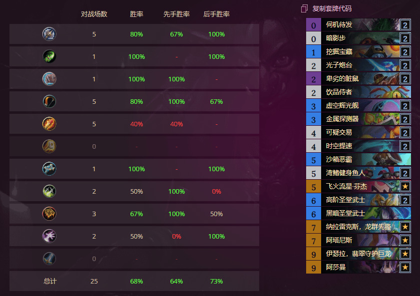 对战法师:看脸,输的好几场都是拉好几下没拉到巨像输掉,因此实际胜率可以还能提一提。打法师还有一个关键要素是阿曼莎偷的牌质量的高低,也看脸。