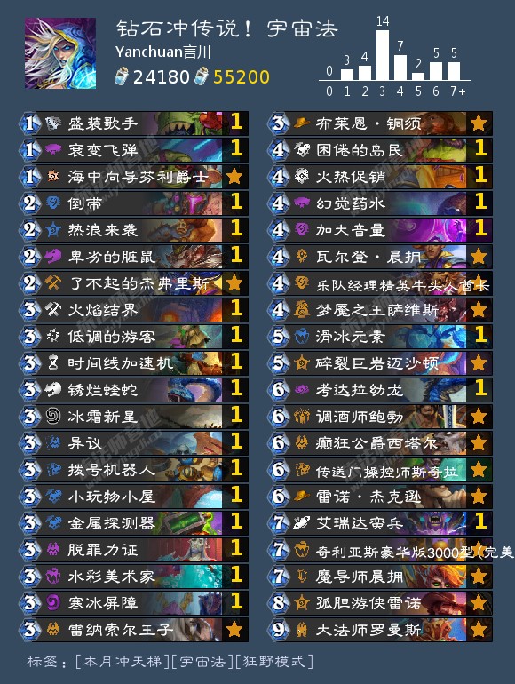 起手找异议/冰环/拖罪/水彩,尽量先投资控制冰霜法术,然后就是4费晨拥/岛民/拨号(拨号有8就拨,可以4费配合时间线加速机3+1拨神雷),也是拖回合8费神雷劝退思路,变身前多骗对面资源。(有盛装歌手&刀必留)
