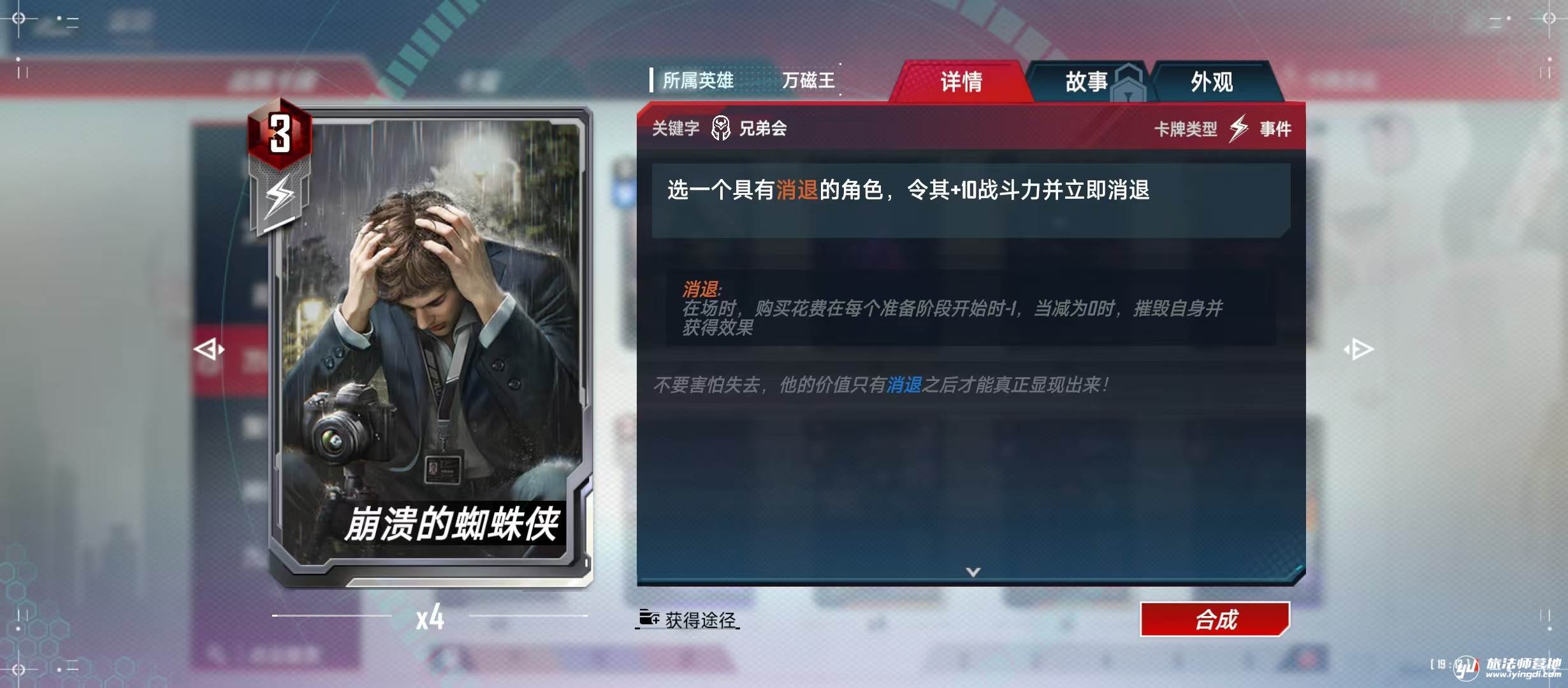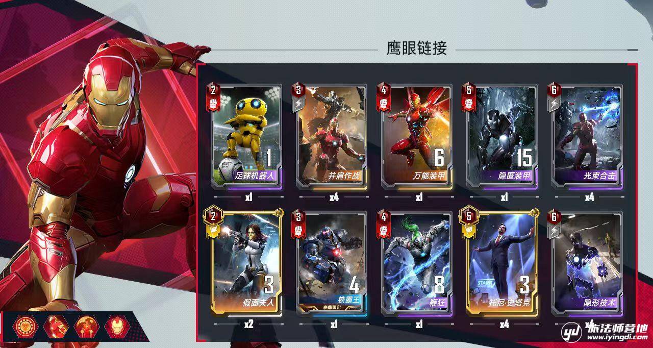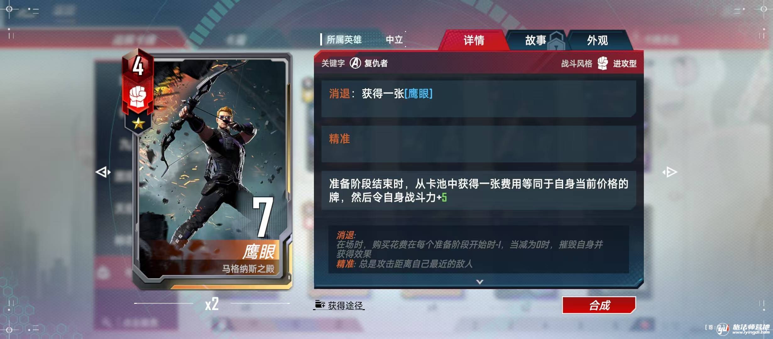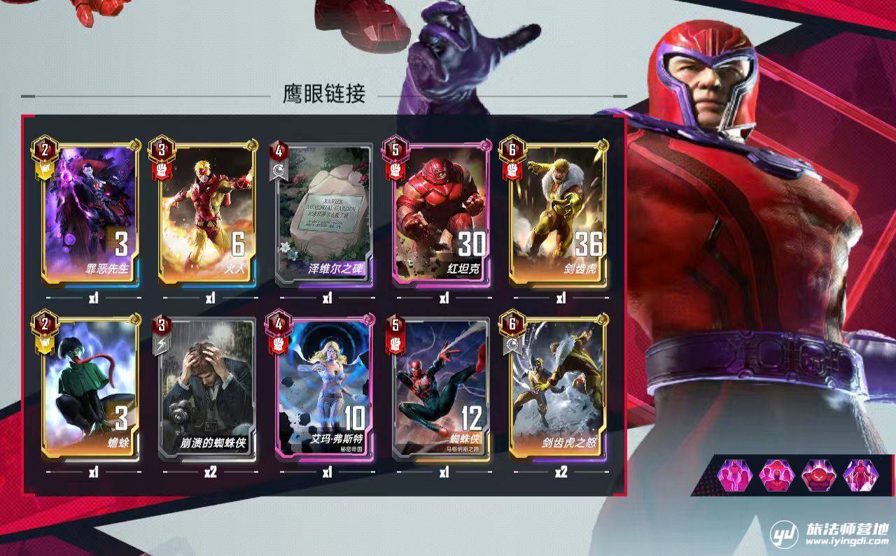 四费:小鹰眼,核心卡,最终阵容需要2+1小鹰眼所以带三张即可,消退鹰眼,配合崩溃的蜘蛛侠快速凑齐链接