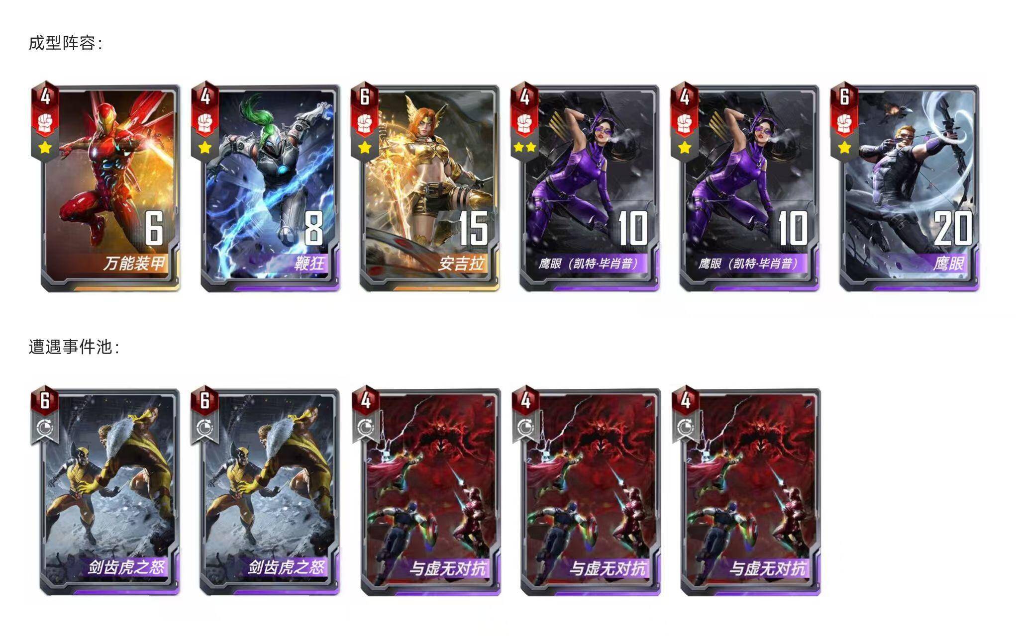 八回合及以后:此时还没凑齐的话多半已经出局了,凑齐的话一般就是万能+鞭狂+消退鹰眼+小鹰眼+小鹰眼+鹰眼然后升本找安吉拉