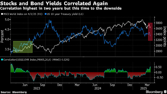 对经济衰退的担忧日益加剧,这从各种资产类别中都可以看出。股票和债券收益率再次同步变动,相关性达到两年来的最高水平。但与2023年两者同时上涨的情况不同,这次两者都在下跌,这是经济增长预期下调的典型信号。
