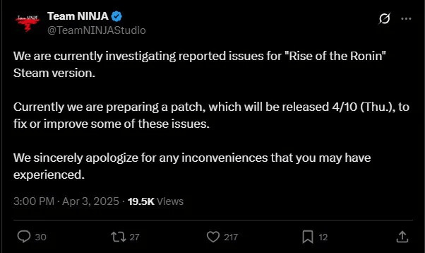 开发团队Team Ninja 现在已正式向粉丝道歉,他们已推特上在发布道歉声明,承认《浪人崛起》Steam 版本中问题众多,准备提供修复补丁来缓和玩家们的怒火,该补丁将于 2025 年 4 月 10 日发布。