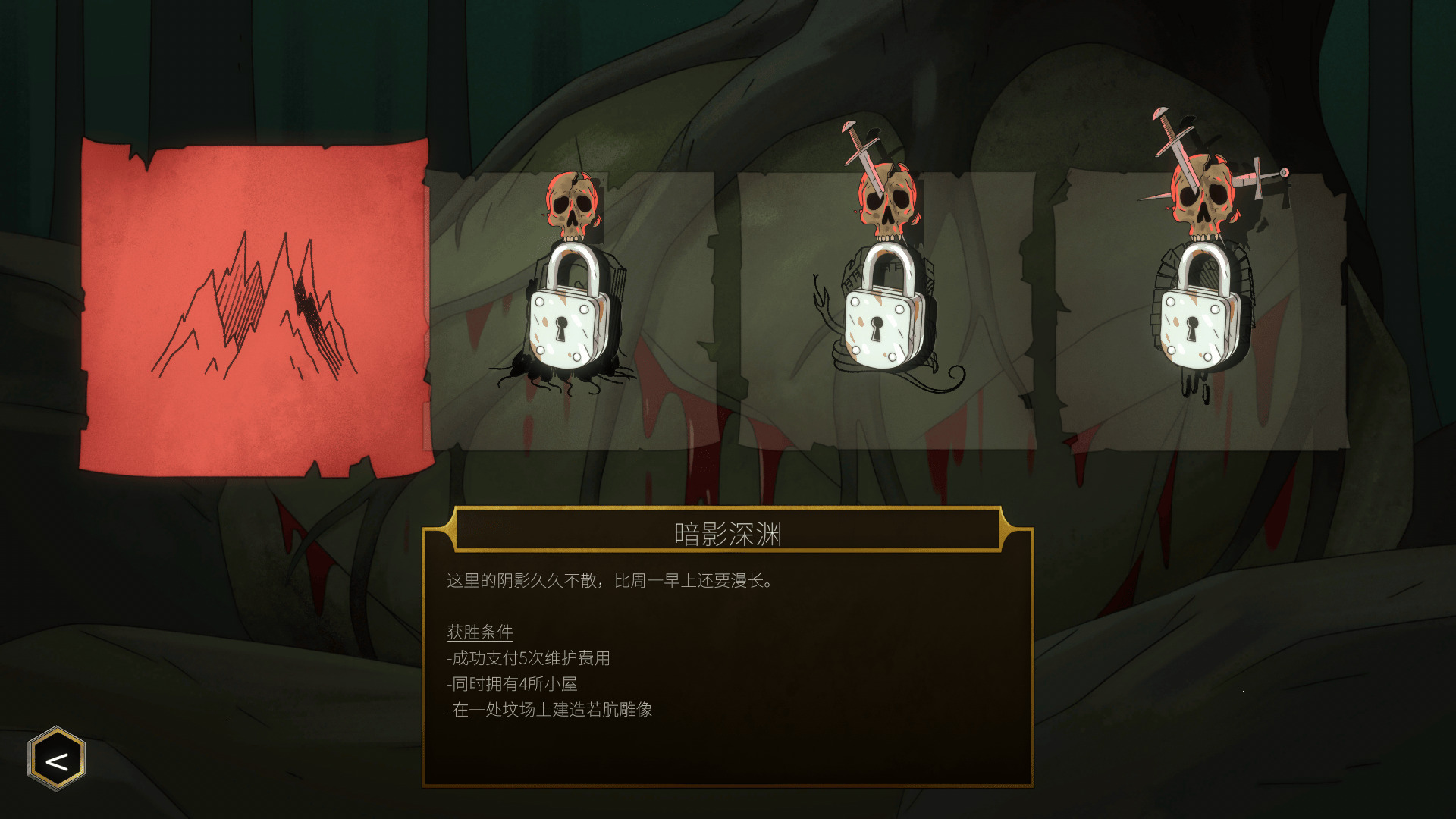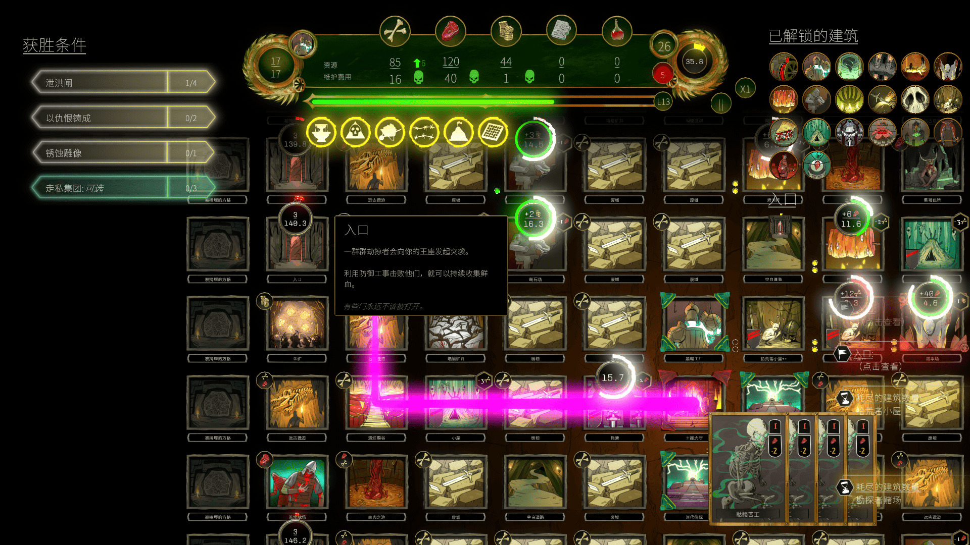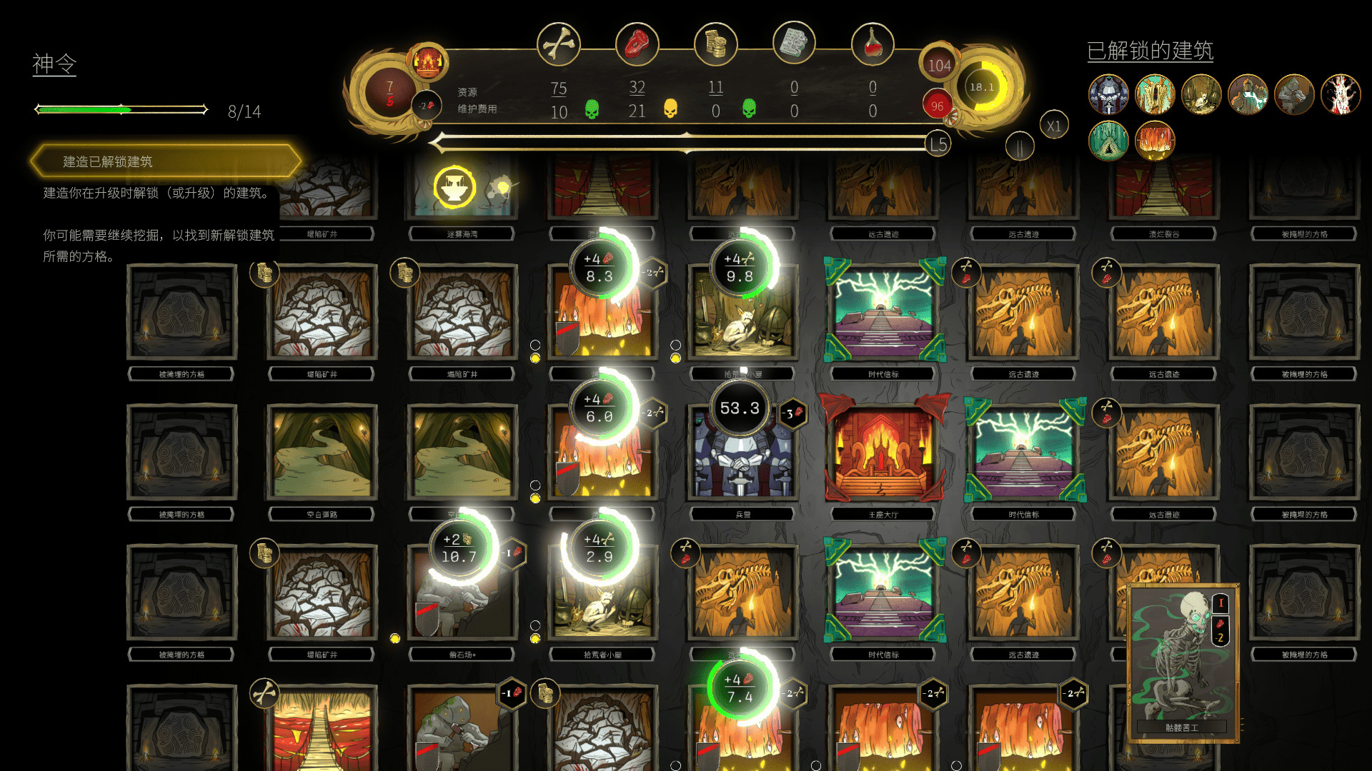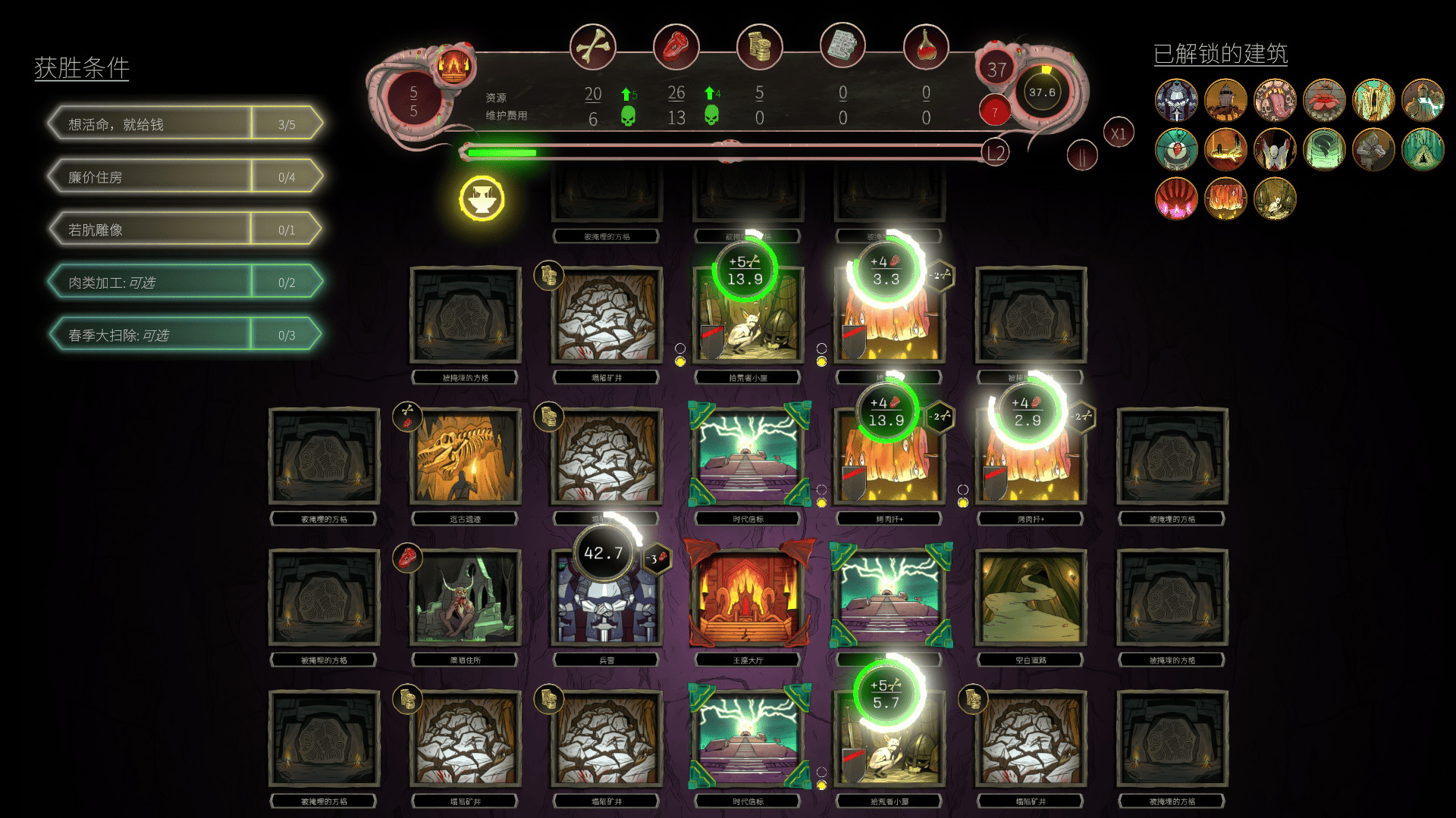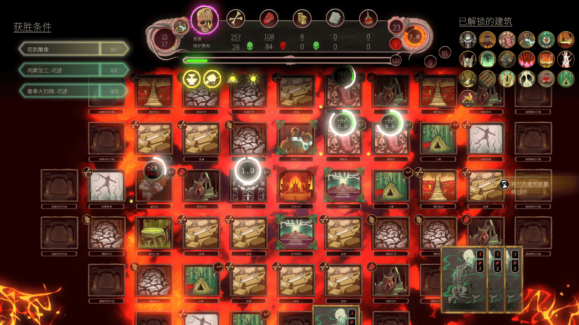 你必须在有限回合内平息邪神怒火,帮它完成"升格仪式"。右上角数字是倒计时,归零即游戏结束。左侧面板显示必选任务,完成后获胜;额外任务可解锁奖励。 每回合自动扣除骸骨/鲜肉/黄金/知识作为"供奉费"。资源不足会触发警告,连续两次欠费直接失败!建筑、仆从会增加消耗。