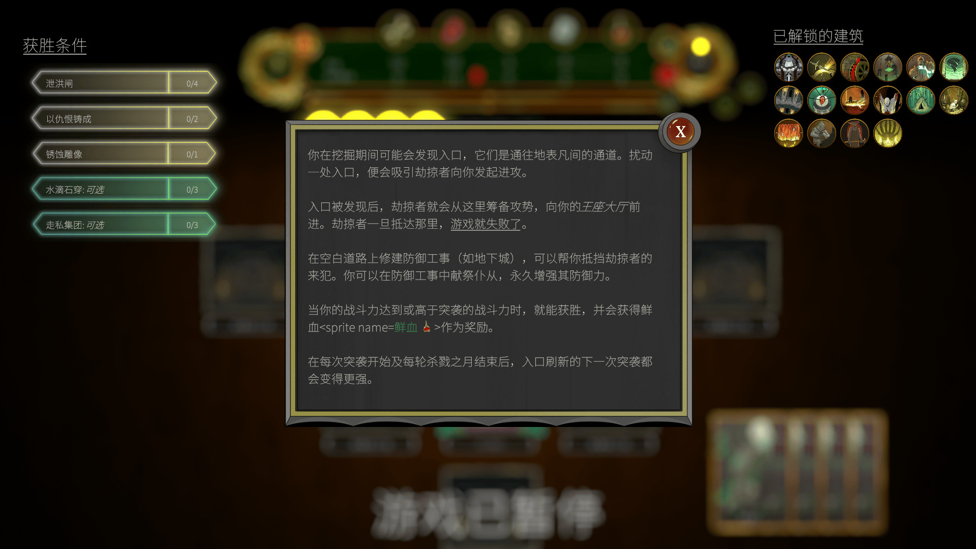 从第二关开始,挖掘可能触发入口,引来突袭者沿路线进攻。必须在沿线建防御建筑并献祭小怪提升战斗力。突袭者会摧毁非防御建筑,若攻破王座即输。