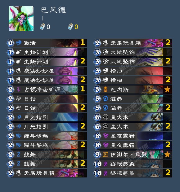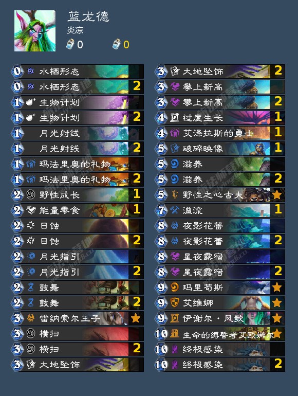 第二种形态是蓝龙德,可以说是国服特色科研研发的otk卡组,otk的意思是one turn kill,一回合斩杀卡组,其意思为整个卡组的制胜逻辑都在一回合斩杀掉,核心是把所有的随从拉到场上,然后靠蓝龙给予的高法术伤害,用直伤获胜,要点较少,但有需要提醒的点,花蕾给艾维娜或者风歌,不要给旅行管理员杜加尔,因为法术召唤不会触发战吼的,谨记一点,只要蓝龙没被破坏就能启动,就还有希望 ,但杜加尔削弱了,可以考虑换成破碎映像辅助启动,但也可以继续采用,但就是要加入零食或者第二张攀上新高了,伤害牌有礼物给的横扫,有自带的横扫,也有1费的月光射线,还有感染,我是建议变成破碎映像的构筑,操作空间大一点,抗破坏性更高,但是对你的打牌要求更高了,比如说,先花蕾拉出泰坦,然后回费再打出破碎映像,把泰坦拉第二个到场上,面对快攻可以回满血,对面就没法偷鸡斩杀了,面对慢速可以直接抽牌,保证自己的启动组件全部到手,代替了溢流的作用,还有就是面对快攻可以携带一张传播瘟疫,树人大战甲壳虫,炉石经典名画了。