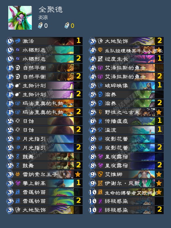 比如,月光指引给的复制随从,或者复制检索,很好的润滑牌或者能起到反破坏的作用,0费水栖形态的探底,牌库底的检索,防止沉底和鬼抽,3费的大地坠饰的定向随从抽取,花蕾定向找随从,这是检索的科技树。