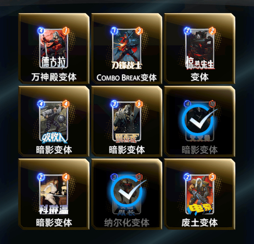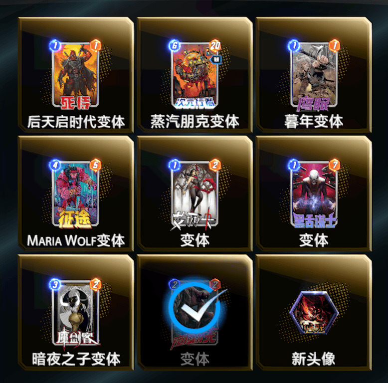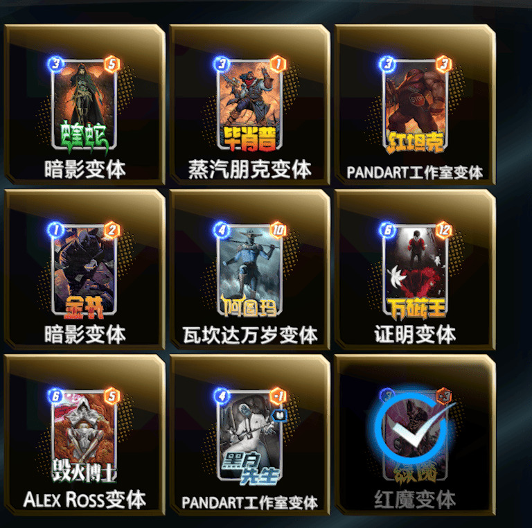 神守卫(特殊衍生物变体)、红斗篷(特殊衍生物变体)、银色武士、蜘蛛侠2099以及选择完终极奖励之后进入奖池的黑骑士变体。