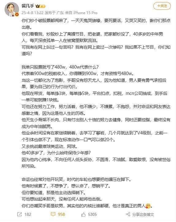4月8日消息,今天,网红“留几手”透露,自己炒股亏了480万。